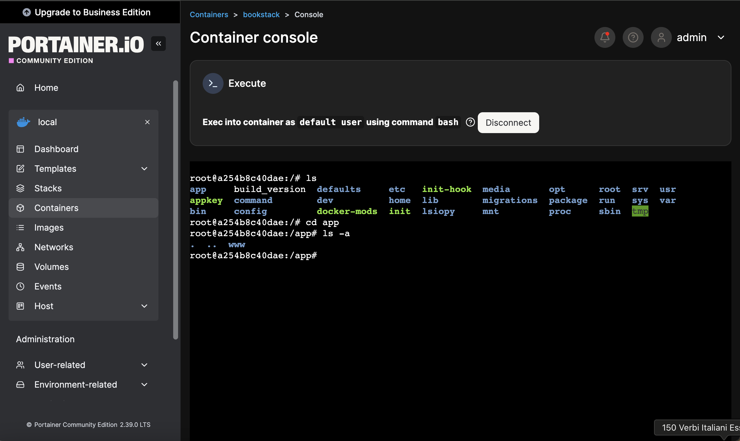 Ich habe mich im Portainer auf den Docker eigeloggt. Dort finde ich aber den Pfad nicht, welchen du angegeben hast… (s. Foto). Was mache ich falsch? Ich habe es auch über das Terminal versucht. Habe mich auf LWS eingeloggt, dann mit sudo -i mir Rootrechte gegeben, und dann auf /root/bookstack/ nachgeschaut. Aber auch dort gibt es keinen Ordner mit App/…