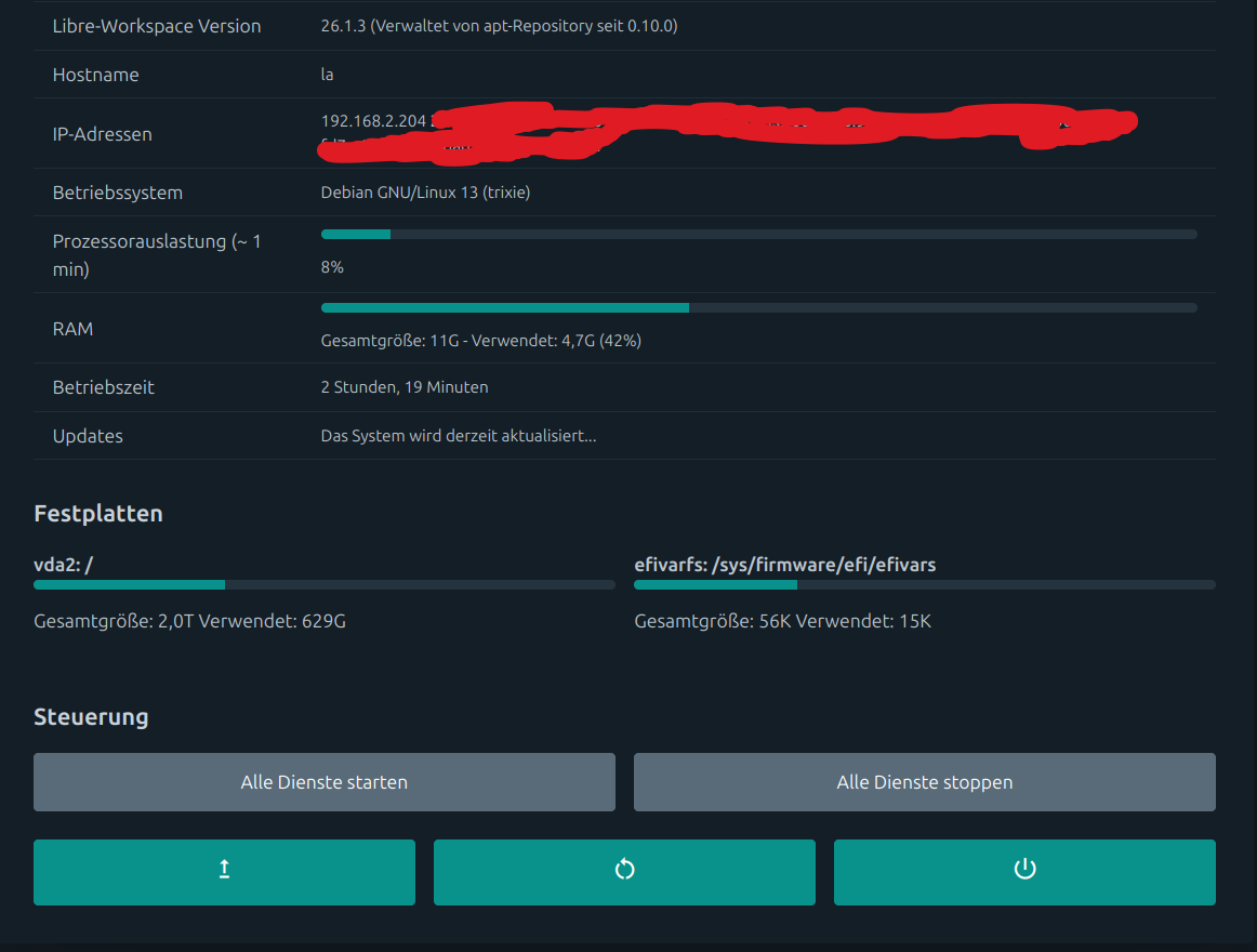 Also, bei mir steht immer noch, dass das System gerade aktuallisiert wird. Hat es aber nicht. Ich hatte immer noch Version 26.1.3. Nun habe ich im Terminal die Aktuallisierung angestoßen, was auch geklappt hat. Nun habe ich Version 26.2. Ich habe LWS danach neu gestartet, in der Hoffnung, dass dann alles wieder ok ist, aber es steht sofort wieder “Das System wird gerade aktuallisiert” da. Das Backup heute Nacht ist natürlich wieder fehlgeschlagen.