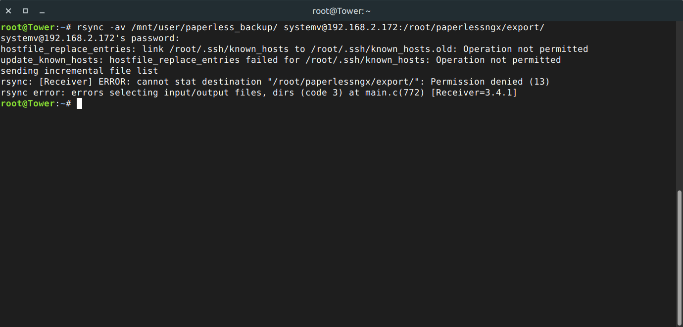 rsync -av /mnt/user/paperless_backup/ systemv@192.168.2.172:/root/paperlessngx/export/
