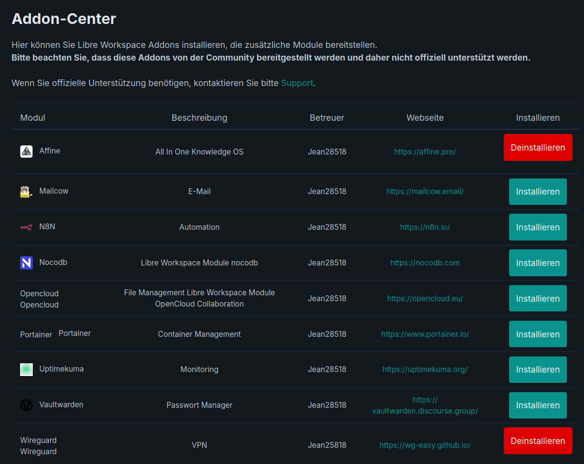 ich wollte das neu bereitgestellte Add-on „Affine“ auf meinem Libre Workspace installieren. Leider wurde das Add-on nicht korrekt installiert: Auf dem Server liefen zwar zwei Docker-Container, aber ich konnte Affine nicht erreichen. Daher habe ich versucht, es über die Option „Deinstallieren“ im Add-on-Center zu entfernen. Dabei ist offenbar etwas schiefgelaufen (das Deinstallationsfenster hat sich nicht mehr geschlossen – ich habe es 3 Stunden laufen lassen). Die Docker-Container wurden zwar gestoppt bzw. gelöscht, aber im Add-on-Center wird weiterhin die Option „Affine deinstallieren“ angezeigt.